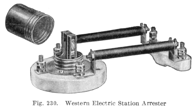 CHAPTER XIX—High Potentials—Air-Gap Arrester—Discharge across Gaps—Types of Arrester—Vacuum Arrester—Strong Currents—Fuses—Sneak Currents—Line Protection—Central-Office and Subscribers' Station Protectors—City Exchange Requirements—Electrolysis