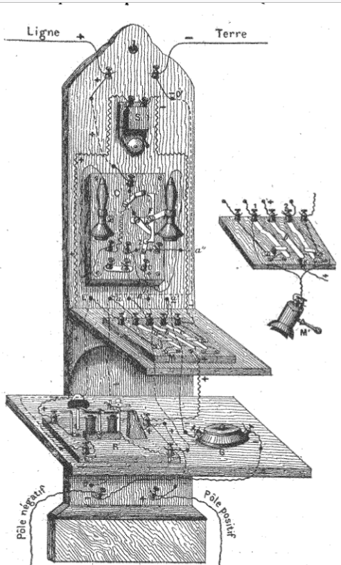 M est un transmetteur microphonique de M. Ader, dont les fils sattachent