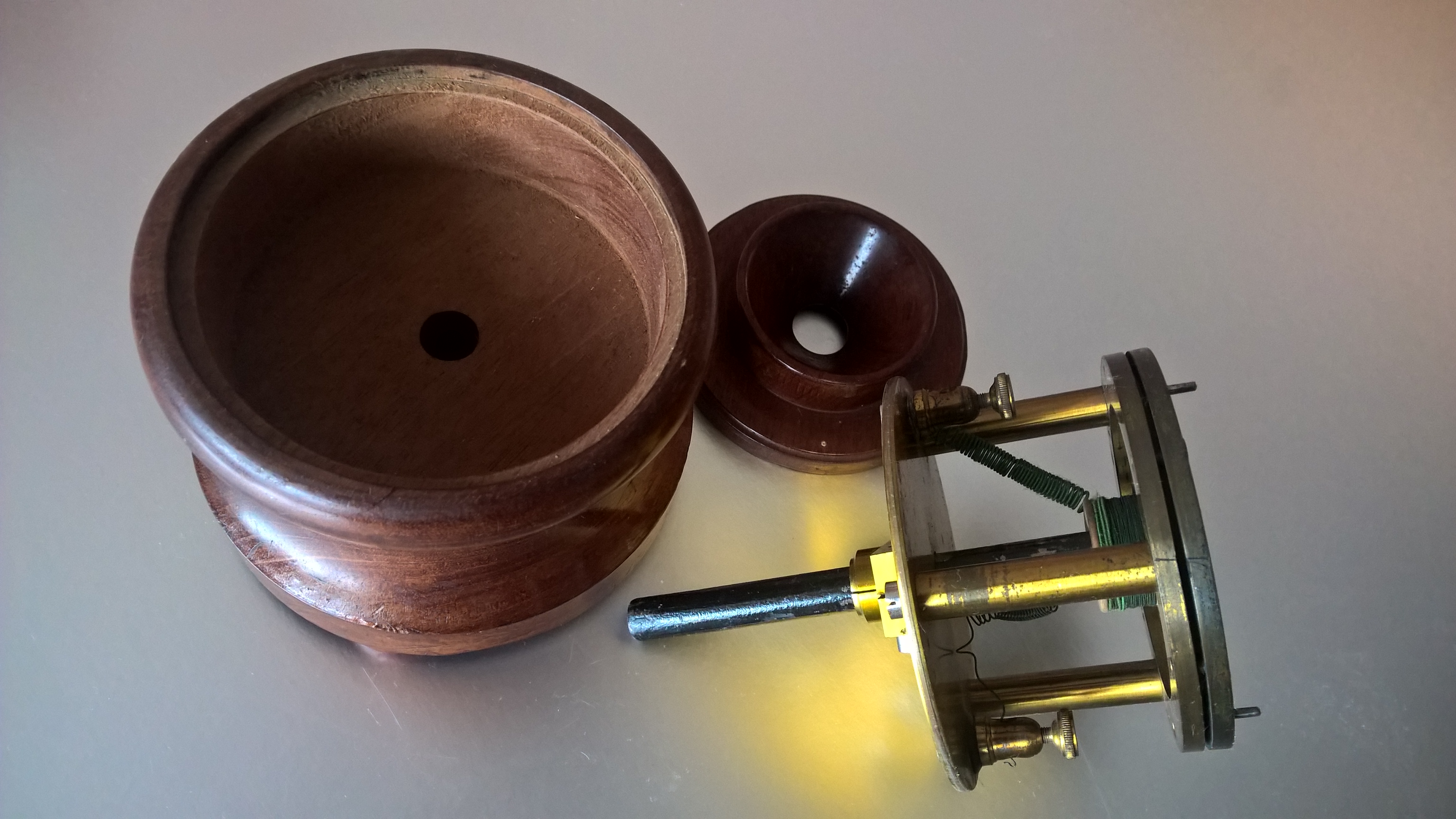 ![]() Compte tenu de sa taille, de son poids, des 3 pieds en bois et de sa grande puissance magnétique, cet appareil pourtant réversible, servait probalement d'écouteur posé sur une table pour pouvoir entendre dans toute la salle. Dans ce cas on utiliserait alors la "poire" comme microphone. ![]() Seul ce modèlei est muni d'une coque en bois recouvrant la partie magnétique. S'agit il d'un original ou d'une adaptation maison ? le mystère reste à élucider. Si vous en savez plus, merci de m'apporter des compléments d'information sur ce sujet.