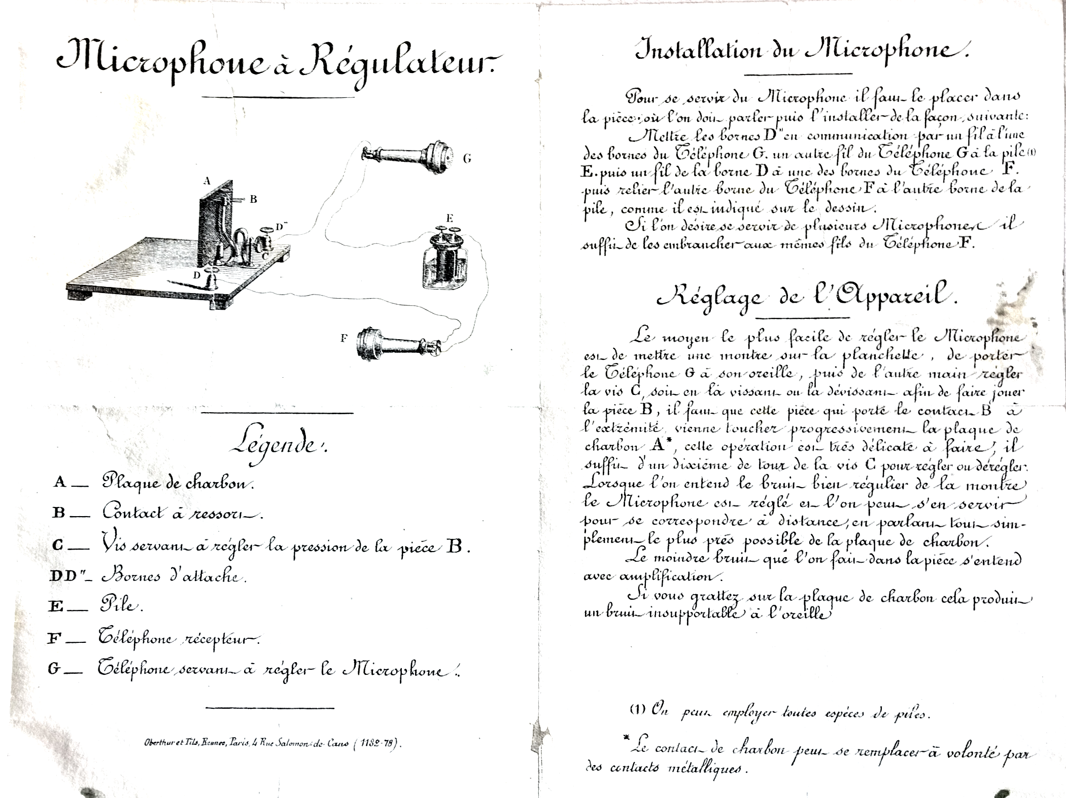 En 1877 HUGHES expérimente un crayon de graphite taillé en pointe aux deux extrémités et le met en vibration avec un courant électrique entre deux plaques de charbon. Il découvre le principe du microphone à charbon et contribue à améliorer le transmetteur téléphonique de Graham Bell. |
