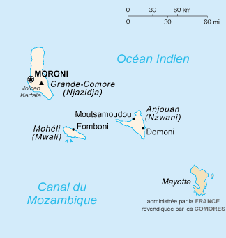 Le pays a pour capitale Moroni, pour langues officielles le comorien (shikomor),