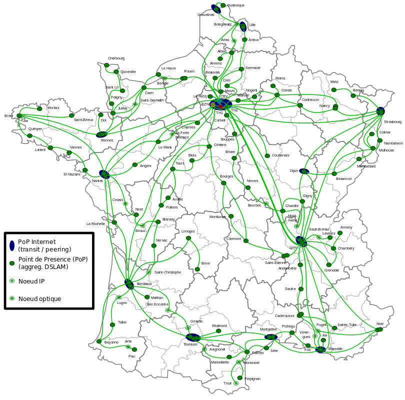 fibre optique en France (et en Europe), entre les Centres Téléphoniques