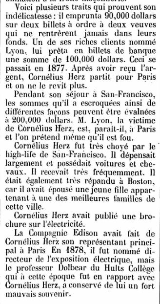 Comme M. Graham Bell, comme M. Edison, le docteur Cornélius Herz est citoyen américain, mais il n'est pas natif d'Amérique; il est né à Besançon le 3 septembre 1845 et mort à Bournemouth (Angleterre) le 6 juillet 1898 était un médecin et un homme d'affaires franco-américain impliqué dans le scandale de Panama, mais pour la téléphonie il est le concepteur du microphone à condensateur en 1880.