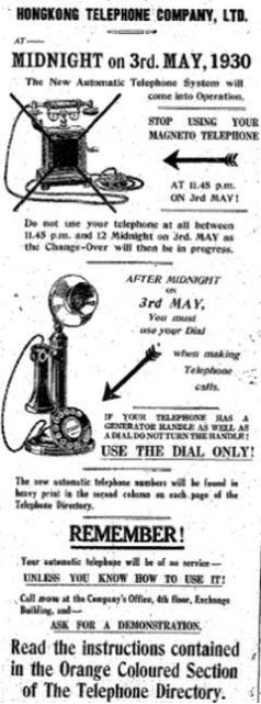 En 1930 La Hong Kong Telephone Company a remplacé tous