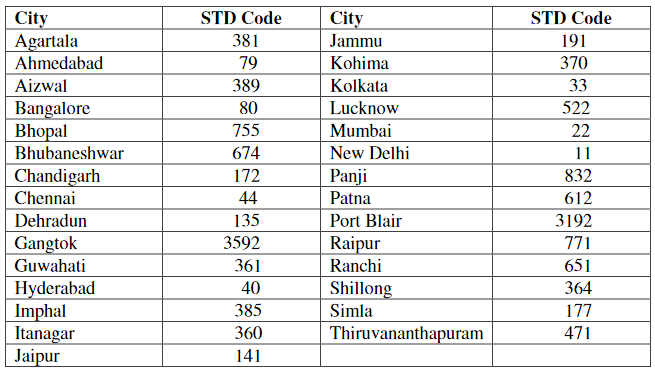 En Inde, les codes de ville comportent de 2 à 4 chiffres, par ex. pour composer un numéro à Delhi de l'extérieur, l'abonné doit composer le 011 suivi du numéro à Delhi. Ici, 11 est le code STD de Delhi et 0 est le préfixe pour indiquer qu'il s'agit d'un appel STD.
