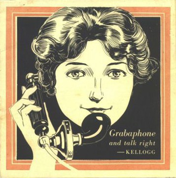 En 1905, Kellogg présenta le premier téléphone à combiné fabriqué par un fabricant américain. Il s'agissait d'un téléphone compact destiné à tirer parti des nouveaux standards à batterie centrale, qui éliminaient le besoin de piles encombrantes dans le téléphone du client. Il s'agissait d'une alternative plus moderne au téléphone à chandelier. Ils l'appelèrent d'abord le Microtelephone, mais le nom fut rapidement changé en GrabAPhone. Au départ, le téléphone était principalement construit à partir de leurs propres pièces et d'un combiné Ericsson. Dans le modèle ultérieur F111, ils semblent avoir utilisé la base d'un téléphone à chandelier Ericsson, un support et un combiné Ericsson. La tige était recouverte d'un manchon en bakélite, qu'ils appelèrent « Kellite », comme celui utilisé sur leur téléphone à chandelier. Les marques Ericsson ou Kellogg se trouvent sur ce manchon en bakélite, il semble donc que le téléphone soit le fruit d'une coopération. En un an environ, la base du GrabAPhone fut remplacée par une base adaptée du chandelier F118 de Kellogg. Kellogg utilisa progressivement de plus en plus de ses propres pièces au fur et à mesure que le téléphone s'avéra efficace. Le combiné Ericsson a été remodelé sur des lignes moins élaborées, les terminaux étant fermés et les supports arrondis substitués aux supports à piliers d'Ericsson. Vers 1912, le support Ericsson avait été remplacé par un support en acier embouti plus simple, avec une finition en nickel plaqué. À la fin de la Première Guerre mondiale, la plaque de nickel avait disparu et l'ensemble du téléphone était désormais fini en noir japon, une finition en émail cuit. En 1918, l'usine Ericsson a fermé et Kellogg a acheté de nombreuses pièces et matrices. Le GrabAPhone avait ses faiblesses. L'émetteur était vertical en utilisation, il ne donnait donc pas un signal aussi fort qu'un émetteur dans lequel le son était appliqué directement au diaphragme. La coupelle sur l'embouchure surmontait en partie ce problème. Le signal plus faible réduisait cependant un peu le son local (le son local se produit lorsque le signal de l'émetteur est renvoyé vers le récepteur). Il utilisait également une "bobine de retardement", qui réduisait le son local du signal déjà plus faible. Le montage de l'émetteur de manière à ce qu'il soit vertical en utilisation normale aidait à réduire le tassement des granules de carbone, ce qui était donc un avantage.
