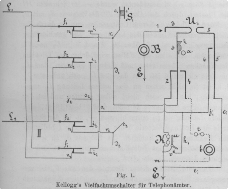 commencé à expirer en 1893. Suite d'articles de Éd. Zetzsche Dans les grands standards téléphoniques, il nest pas rare quun fonctionnaire soit appelé par un abonné alors quil parle ou sert un autre abonné ; Si, dans l'intervalle qui s'écoule avant que l'agent puisse servir l'appelant, un troisième abonné, dont la ligne est assignée à une autre barrière, désire utiliser la ligne de l'abonné appelant, l'agent de cette barrière connectera cette ligne à celle du troisième abonné, car il la reconnaît comme inoccupée pendant le contrôle et ne sait rien de l'appel qui en est arrivé au standard. Cela peut toutefois facilement engendrer de la confusion et des désagréments, ce qui ne peut pas se produire avec l'agencement décrit ci-dessous. La disposition choisie par Kellogg peut être utilisée aussi bien dans les réseaux téléphoniques à boucles entièrement métalliques que dans les réseaux à lignes constituées de fils individuels lors de l'utilisation de lignes de terre ; Il peut également être adapté à dautres types de traitement et de test de services. La figure de texte ci-jointe explique cette configuration pour un réseau avec des lignes simples qui sont connectées à la terre E dans le central. Deux lignes L1 et L2 sont représentées, qui sont affectées à deux armoires différentes I et II, et dans celles-ci disposent d'un commutateur de ligne ou de prise U et d'un volet d'appel K ; Toutefois, afin de garder la figure aussi transparente que possible, seuls l'interrupteur U1 et le volet K1 sont représentés pour L1, et de même uniquement pour l'armoire I le téléphone t, qui est prévu pour le fonctionnaire exploitant cette armoire, ainsi que la batterie de test b et la batterie d'appel B. Chaque ligne passe d'abord par un interrupteur jack fn dans chaque armoire, et enfin dans sa propre armoire ; elle atteint toujours d'abord le ressort f, qui repose sur le contact n, et continue ensuite à partir de n ; de sa propre barrière, il continue via r jusqu'à U. La fiche S est généralement insérée avec son extrémité inférieure dans un trou du commutateur U et pousse les deux ressorts 3 et 5 du commutateur si loin sur le côté que - comme le montre l'illustration - 5 est maintenu à l'écart du contact 6, 3, d'autre part, entre en contact avec le ressort de contact 2 et le plie même un peu sur le côté. Le cordon attaché à la fiche S1 dans U1 contient un fil conducteur qui est relié d'une part via r1 à n1 dans I, et d'autre part se termine au contact c1 de la fiche S1 ; Sur la fiche S1 se trouve également un deuxième contact c1, qui est destiné à relier de manière conductrice le contact n avec le contact devant n, qui est isolé contre n, lorsque la fiche est insérée dans le trou jack d'un autre câble. Le cordon attaché à la fiche S1 dans U1