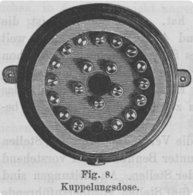 parties vont les fils cassés. Dans l'interrupteur officiel V1, les pièces de contact sont représentées sur la Fig. 2 dans la position dans laquelle elles se trouvent habituellement ; Le curseur, qui n'est pas non plus représenté sur la figure 2, prend sa position la plus haute et laisse les ressorts 11 et 12 en contact avec les contacts 8 et 9. Si le curseur est enfoncé vers le bas jusqu'à sa position médiane, il pousse 11 loin de 8 et le place sur le contact 10, tandis que 12 reste en contact avec 9. Enfin, dans sa position la plus basse, le curseur maintient 12 éloigné de 9 et en même temps également 11 éloigné de 8 et 10. Chaque interrupteur à fiche U contient quatre pièces de contact, 2, 4, 5 et 7, entre lesquelles se trouvent les deux ressorts de contact 1 et 6 ; Une pièce de contact 3 est connectée au ressort 1, mais est isolée de 3. Tant que la fiche S est insérée avec son extrémité inférieure dans le trou de l'interrupteur U, elle presse le ressort 6 contre le contact 7 et le maintient hors de contact avec 5 ; En même temps, pendant cette insertion de la fiche S, qui est supposée sur la Fig. 2 en U1 et qui est habituellement effectuée, le ressort 1 est retiré de 2 et le contact 3 de 4. Si, par contre, on retire la fiche S1 du trou de U1, 1 entre en contact avec 2 et 3 avec 4, de plus 6 s'éloigne de 7 et entre en contact avec 5. La fiche S1 pour U1 et toutes les autres fiches possède deux pièces de contact c1 et c' à son extrémité supérieure ; de ces deux fils sortent, qui sortent du bas de la fiche et auxquels sont reliés les deux fils d1 et d' contenus dans un cordon de câble ; ces derniers s'étendent jusqu'aux points de ramification r1 et r'. Lorsque la fiche S1 est insérée dans le trou d'un interrupteur à jack, cela doit, pour des raisons qui seront expliquées plus loin, toujours se faire de telle manière que c' vienne en contact avec la plaque i, tandis que c1 saisit le ressort f et le soulève de n. La connexion des différentes parties du bureau de change est clairement visible sur la figure 2. De chaque ligne, par exemple de L1L', une branche L1 va d'abord aux verrous correspondants f1n1 de toutes les armoires, et enfin au verrou de l'armoire I, dans laquelle elle a son volet K1. Partout, on s'approche d'abord du ressort f1 puis on continue à partir de n1. Derrière la poignée du dernier meuble I, il bifurque en r1 dans le fil d1 vers le contact c1 de la fiche S1 et vers l'électroaimant du volet K1, derrière lequel il continue vers 2 et vers 6 dans U1 ; de 7 un fil va directement à la terre E. La deuxième branche L' de la ligne L1L' est en liaison conductrice avec toutes les plaques i1 appartenant à la boucle L1L' aux verrous, mais derrière la plaque i1 dans la dernière barrière 1 elle est également connectée avec 3 et 5, après avoir repris le fil d' en r'. Enfin, le ressort 1 de U1 est relié au ressort 11 par un fil, tout comme le ressort 4 avec 12. Un fil est conduit de la jonction des deux bobines d'électroaimant du téléphone t à la terre E ; l'extrémité libre d'un rouleau est reliée au 9, l'extrémité libre de l'autre rouleau au 8. La pièce de contact du bouton g est reliée au contact 10 par l'intermédiaire de la batterie d'appel B, tandis que son axe est relié à 9.