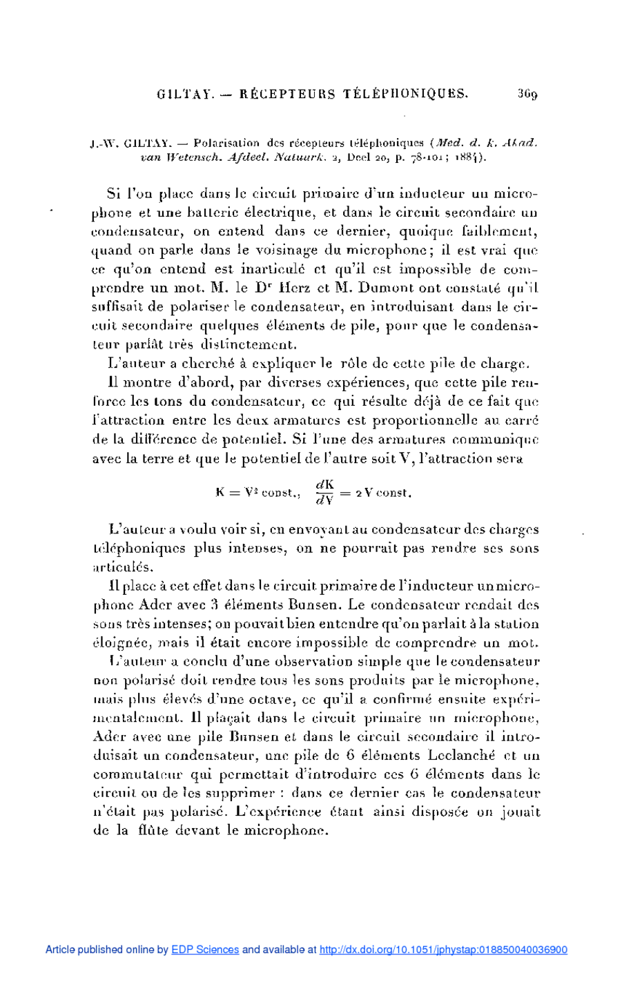 dans le magazine La Nature de 1884 sur l'expérience de J.W. Giltay