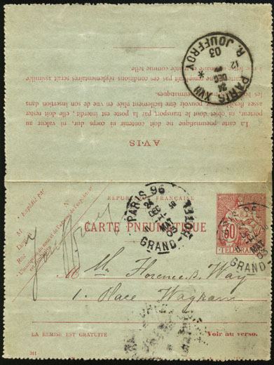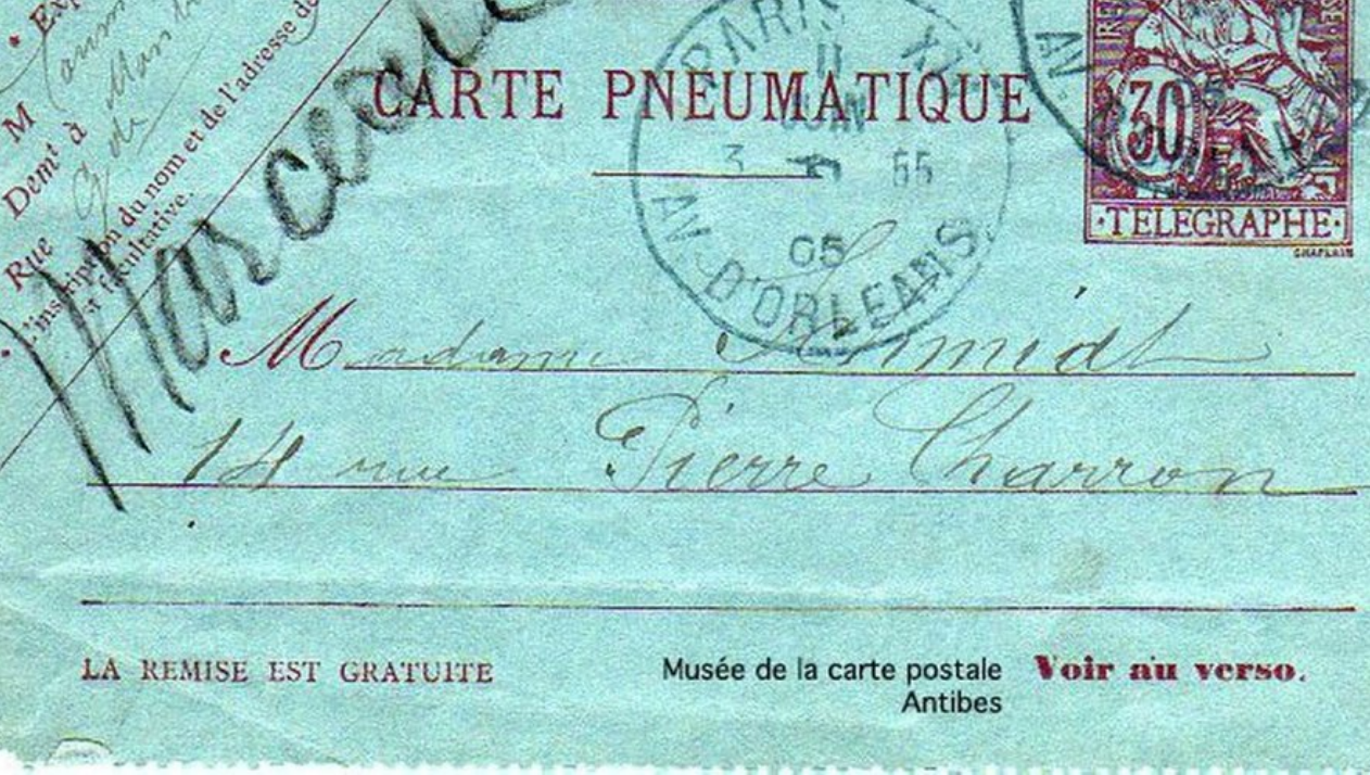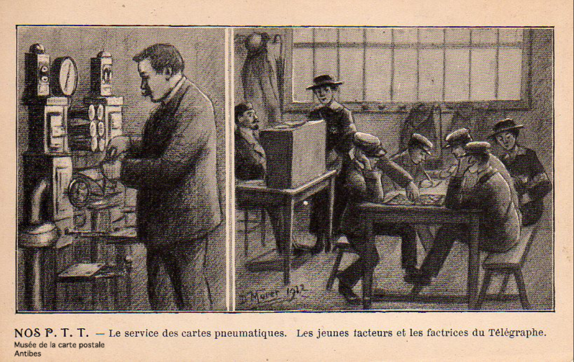 Carte représentant les PTT, facteurs et le service des pneumatiques.