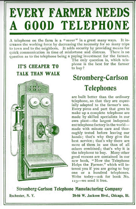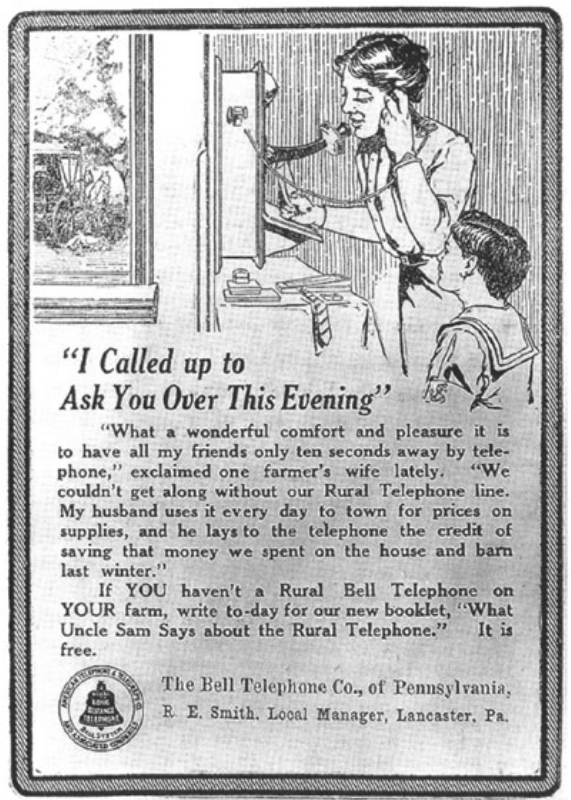 rapide et vigoureux du téléphone entre 1900 et 1912. Service divin Pour les partisans du téléphone dans le comté de Lancaster au tournant du siècle, la possession d'un téléphone était un signe distinctif de l'agriculteur progressiste ou de l'homme d'affaires rural efficace, du médecin ou de l'avocat. Les pages d'un hebdomadaire de village, le New Holland Clarion, louaient le téléphone pour son accès efficace aux informations actuelles : rapports de marché, bulletins météorologiques et horaires de transport. Le téléphone facilitait les affaires en évitant les déplacements inutiles en ville et en gérant rapidement les urgences. Les rédacteurs en chef faisaient la promotion du service téléphonique pour ses contributions potentielles à la croissance, aux profits et à l'efficacité des entreprises locales. Les publicités de la compagnie de téléphone