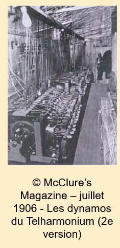 de Thaddeus Cahill LE TELHARMONIUM, LE RÊVE FOU D'UN JEUNE INVENTEUR Le telharmonium, teleharmonium ou dynamophone, est un instrument de musique électromécanique, développé à partir de 1897 par l'américain Thaddeus Cahill (1867 - 1934). Cest le premier véritable instrument de synthèse sonore pour la musique électronique. Il a été conçu pour distribuer de la musique sur le réseau téléphonique américain nouvellement créé qui est à la base du nom de l'instrument : « Telegraphic Harmony » Un peu avant, dans les années 1870, deux autres